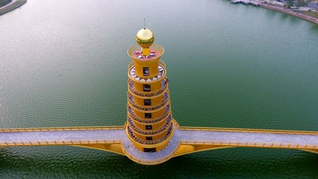Công trình gồm 2 phần: cầu đi bộ và tháp 7 tầng, trong đó cầu dài 178m dạng vòm bằng bê tông cốt thép vĩnh cửu với 3 trụ và 2 mố. Bề rộng trung bình 4,5m và được mở rộng tại vị trí các trụ từ 12m đến 15m. Sử dụng sơn nhũ vàng Kova