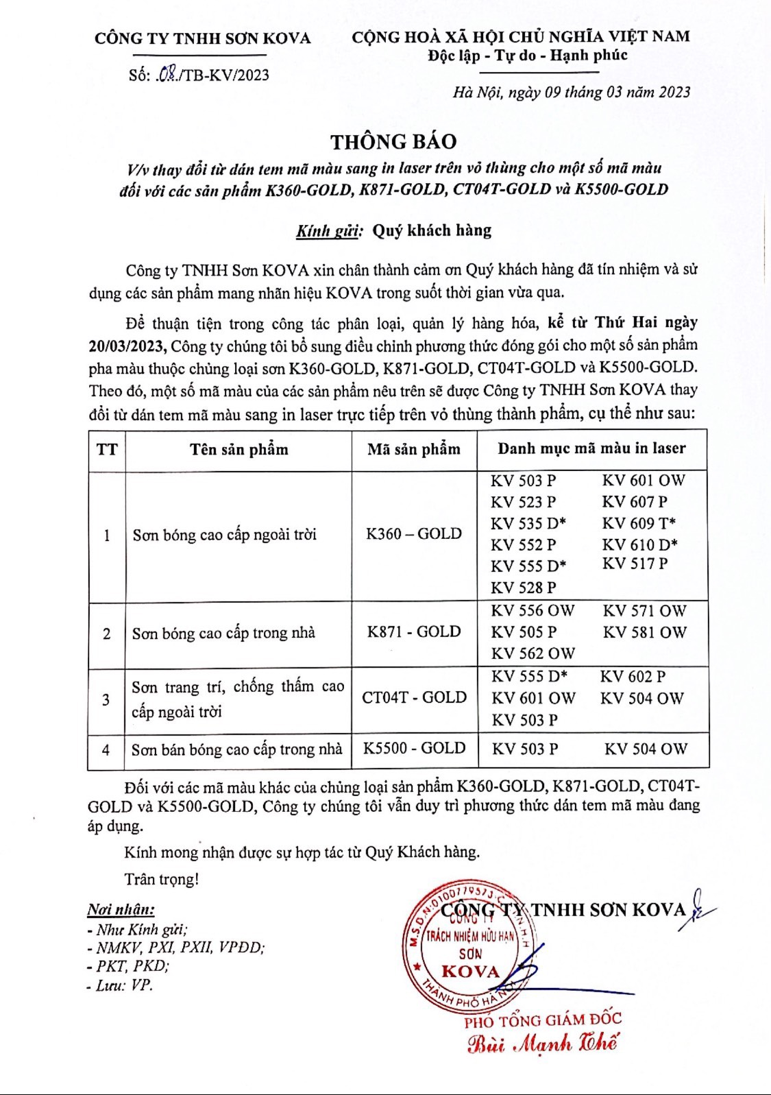 Công ty Sơn KOVA thông báo để thuận tiện trong quá trình phân loại, quản lý hàng hóa, kể từ ngày 20/03/2023 công ty Sơn KOVA thay đổi từ dán tem mã màu sang in laser trên vỏ thùng một số sản phẩm. (Chi tiết vui lòng xem file đính kèm bên dưới)
