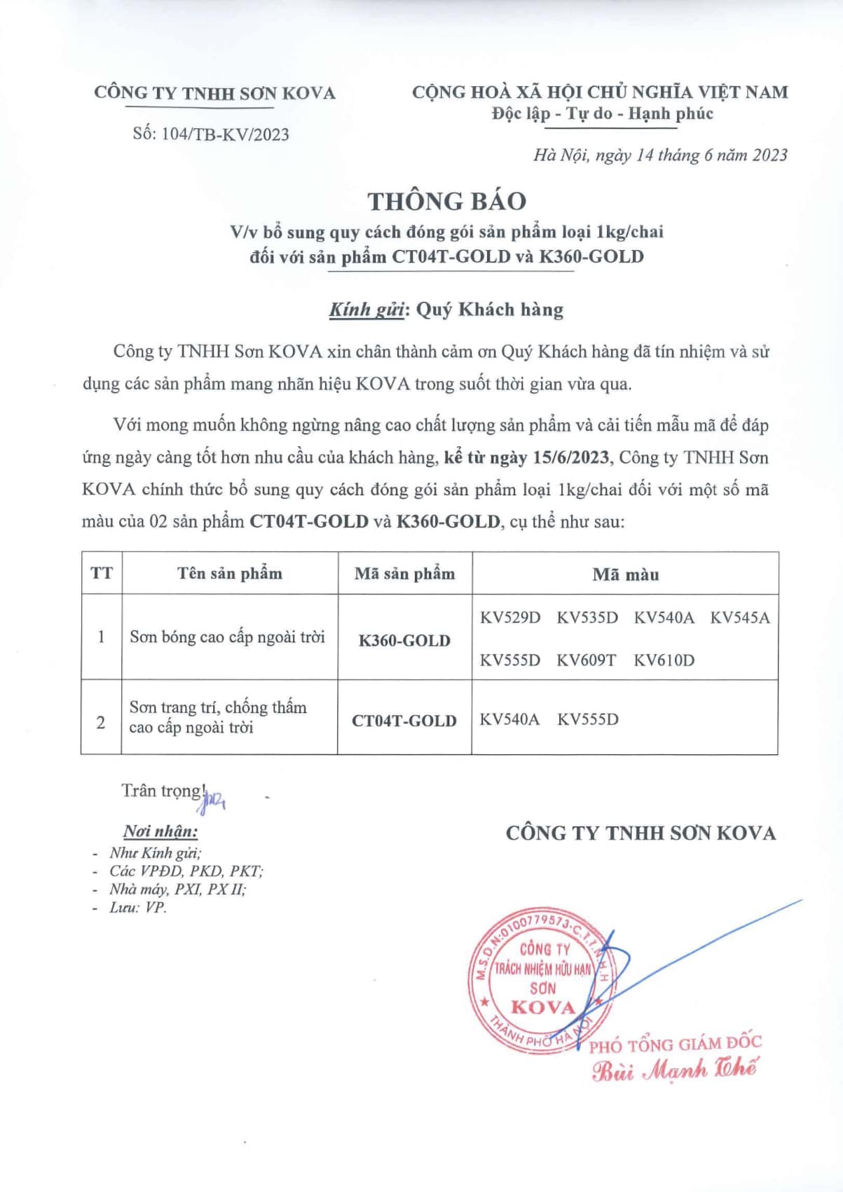 Công ty TNHH Sơn KOVA xin thông báo bổ sung quy cách đóng gói sản phẩm K360 GOLD, CT-04 GOLD loại 01kg từ ngày 15/06/2023 chi tiết mã màu vui lòng xem file đính kèm bên dưới.