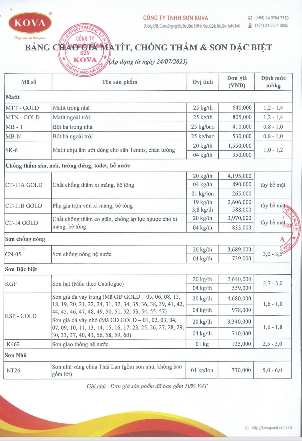 Kính gửi quý khách hàng!Công ty sơn Kova xin trân trọng thông báo, kể từ ngày 24/7/2023, công ty sẽ áp dụng bảng giá mới thay cho các bảng giá đang phát hành. Mọi báo giá từ ngày 24 trở về trước sẽ không còn hiệu lực. Rất mong nhận được sự ủng hộ của quý khách hàng và sự tín nhiệm đối với công ty.