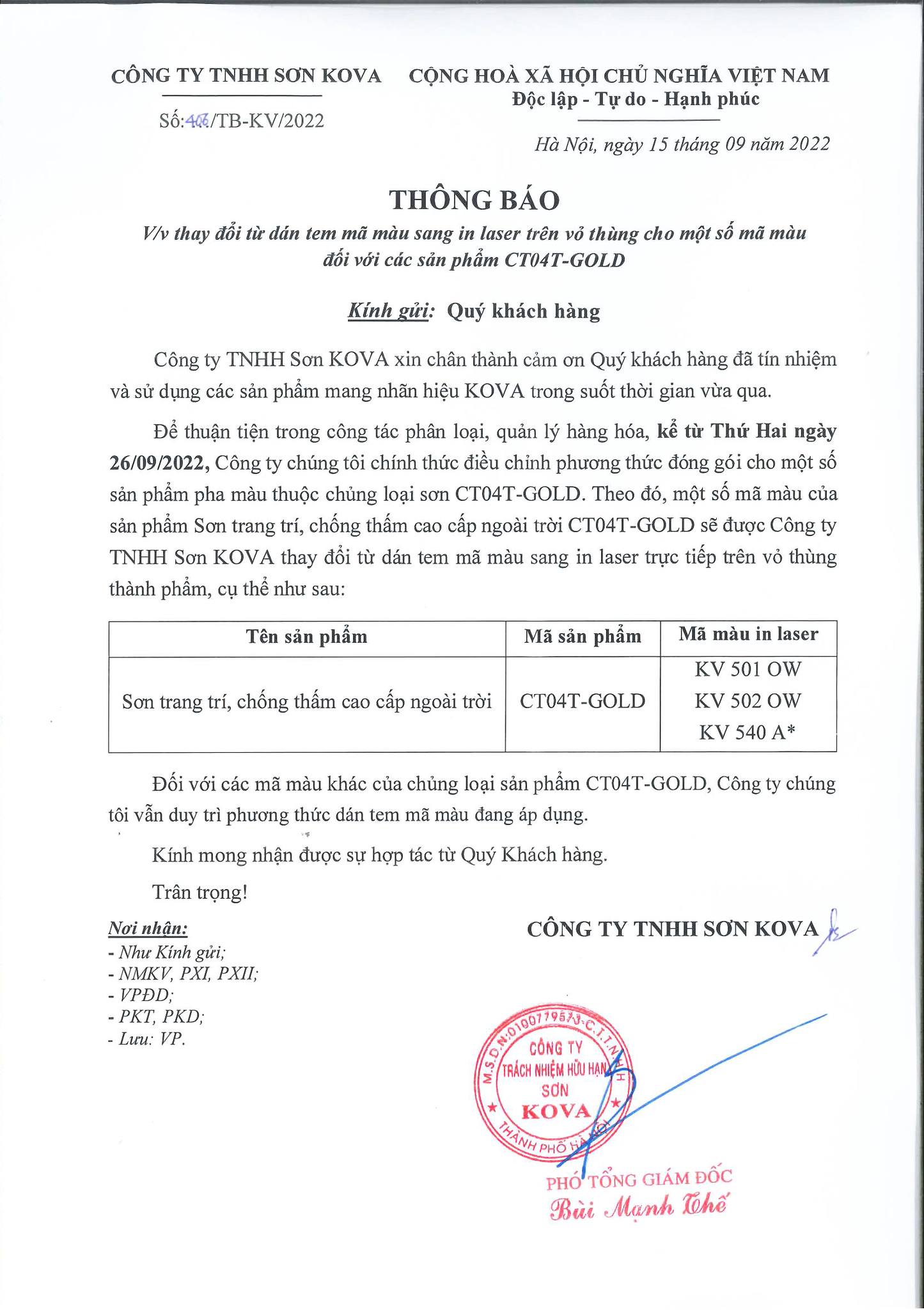Thông báo thay đổi từ dán tem mã màu sang in laser trên vỏ thùng sơn CT04T-GOLD đối với 1 số mã màu sau: